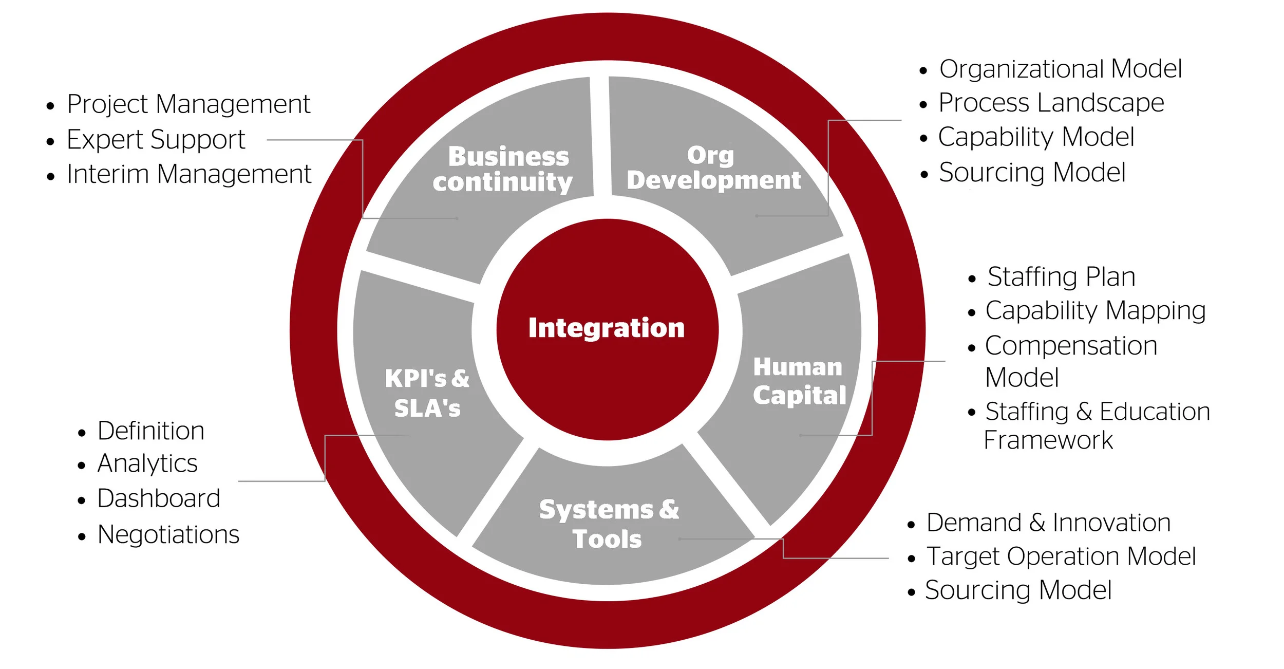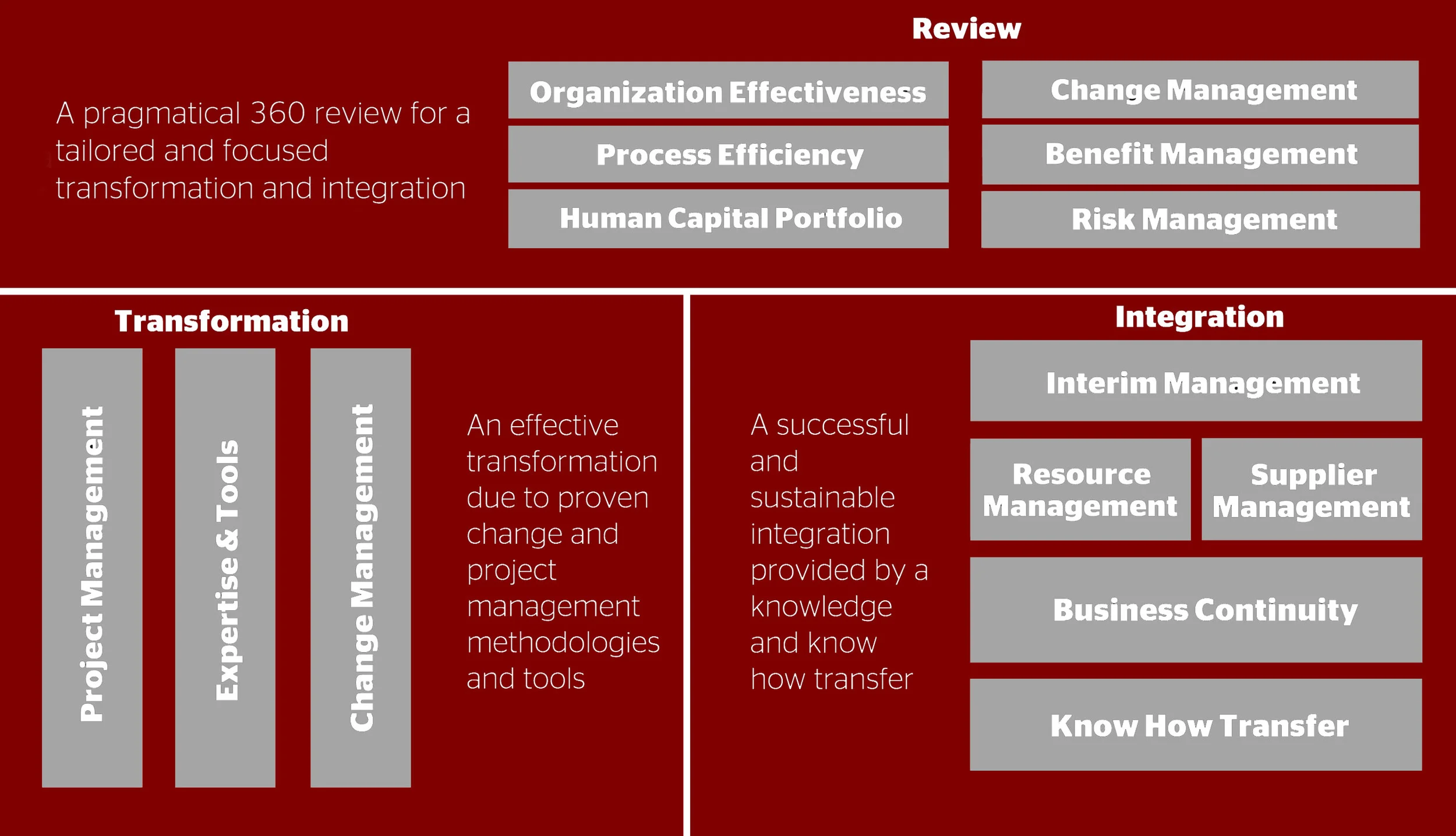 We ensure a sustainable integration and implementation by combining all critical aspects from an Organizational and Human Capital Transformation point of view.